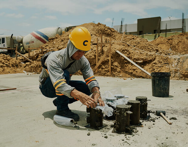 - Toma, curado y resistencia a compresión de cilindros de hormigón.